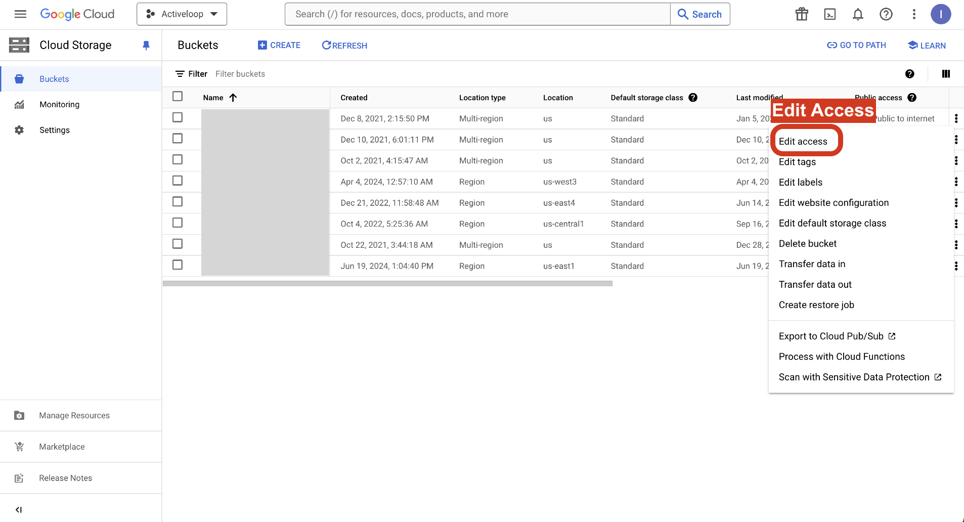2. Select Edit Access for the bucket you want to connect to Activeloop.
