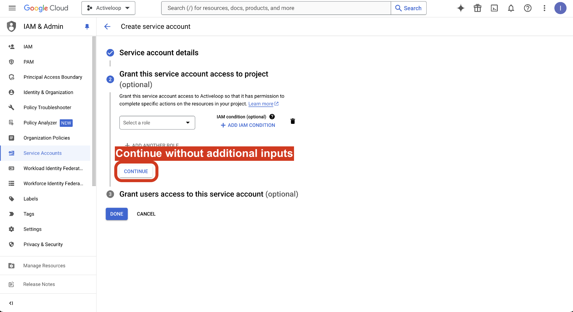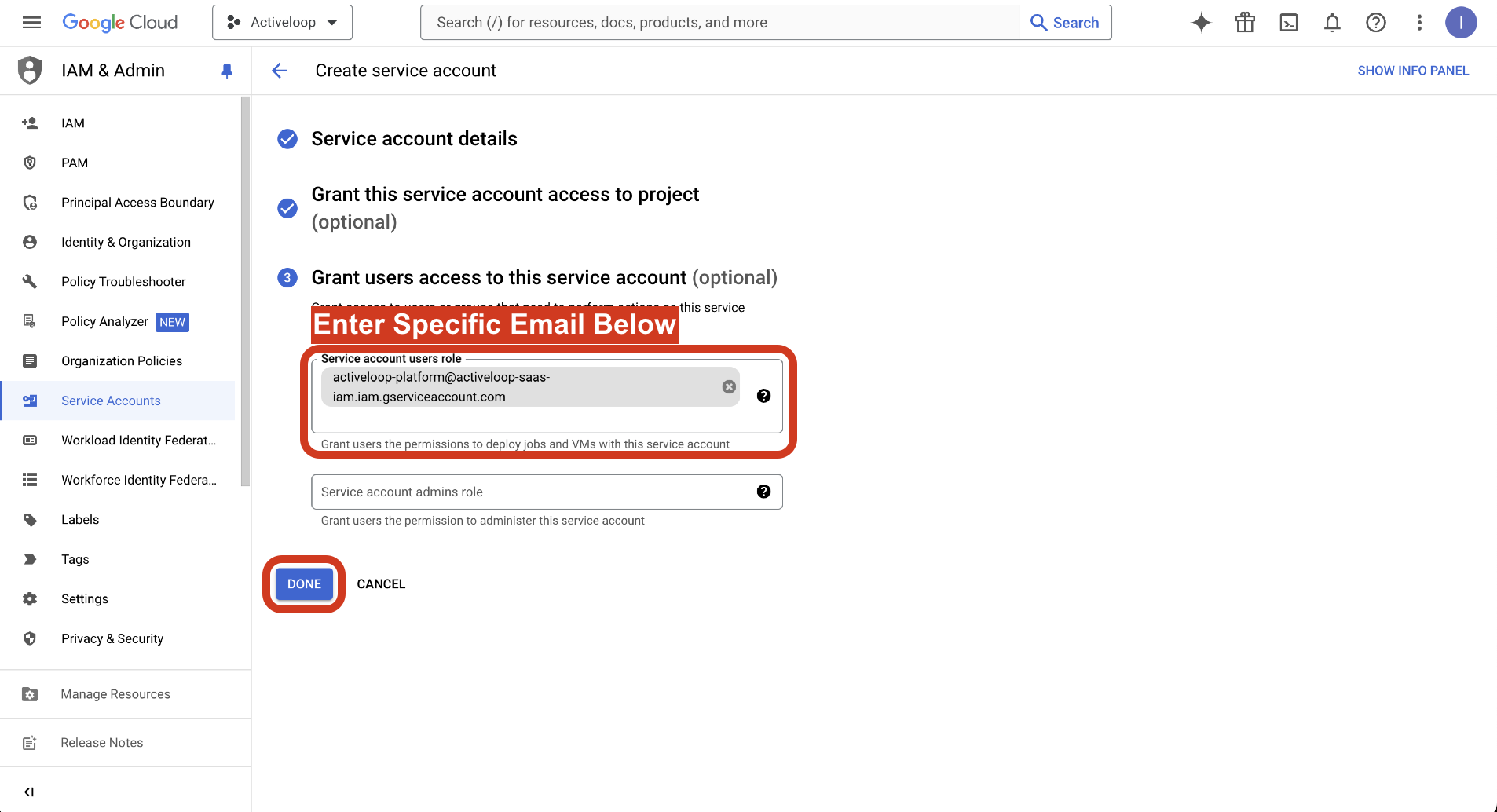 5. Enter activeloop-platform@activeloop-saas-iam.iam.gserviceaccount.com in the Service account users role and click DONE.